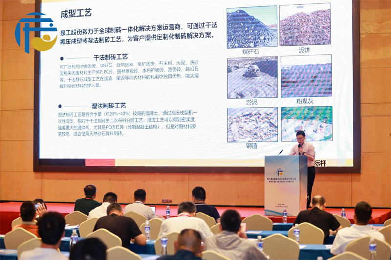 大會聚焦“建筑垃圾資源化利用”與“流態(tài)固化土技術應用”兩大核心議題,旨在推動建筑垃圾治理試點示范及先進技術裝備推廣,助力“無廢城市”建設。會議期間,泉工股份營銷劉經理發(fā)表了題為《綠色智能固廢制磚關鍵技術》的主題演講,系統(tǒng)闡述了泉工股份在固廢資源化利用領域的技術創(chuàng)新與實踐經驗。