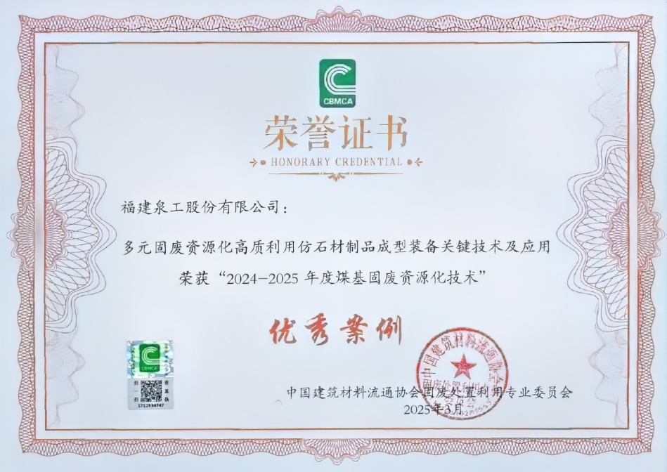 會議期間,泉工股份的“多元固廢資源化高質(zhì)利用仿石材制品成型裝備關(guān)鍵技術(shù)及應(yīng)用”案例成功榮獲2024-2025年度煤基/冶金固廢資源化技術(shù)優(yōu)秀案例。據(jù)悉,此次評選旨在表彰在固廢資源化利用領(lǐng)域具有創(chuàng)新性和示范性的技術(shù)與應(yīng)用,推動行業(yè)規(guī)?;透咧祷l(fā)展,培育發(fā)展固廢綜合利用新質(zhì)生產(chǎn)力。